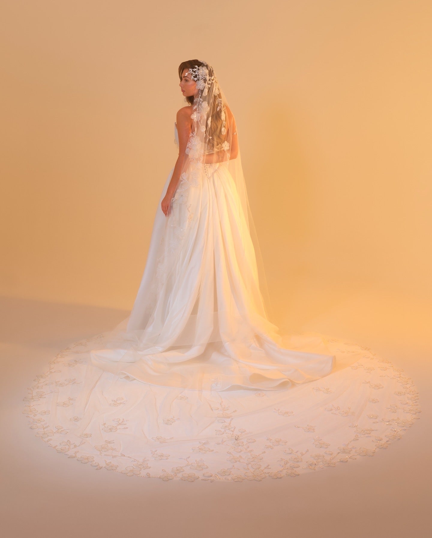 Each motif is carefully placed to give the illusion that the flowers are gently floating along the edge of the veil, creating a truly enchanting bridal moment from ceremony to aisle photographs.